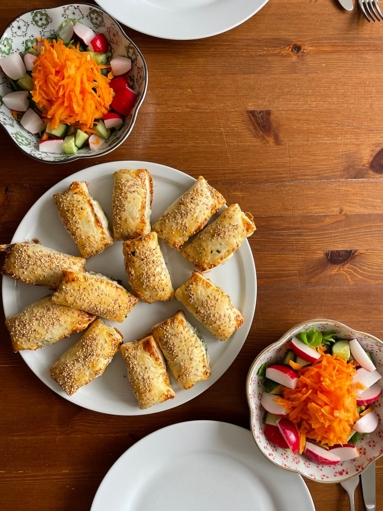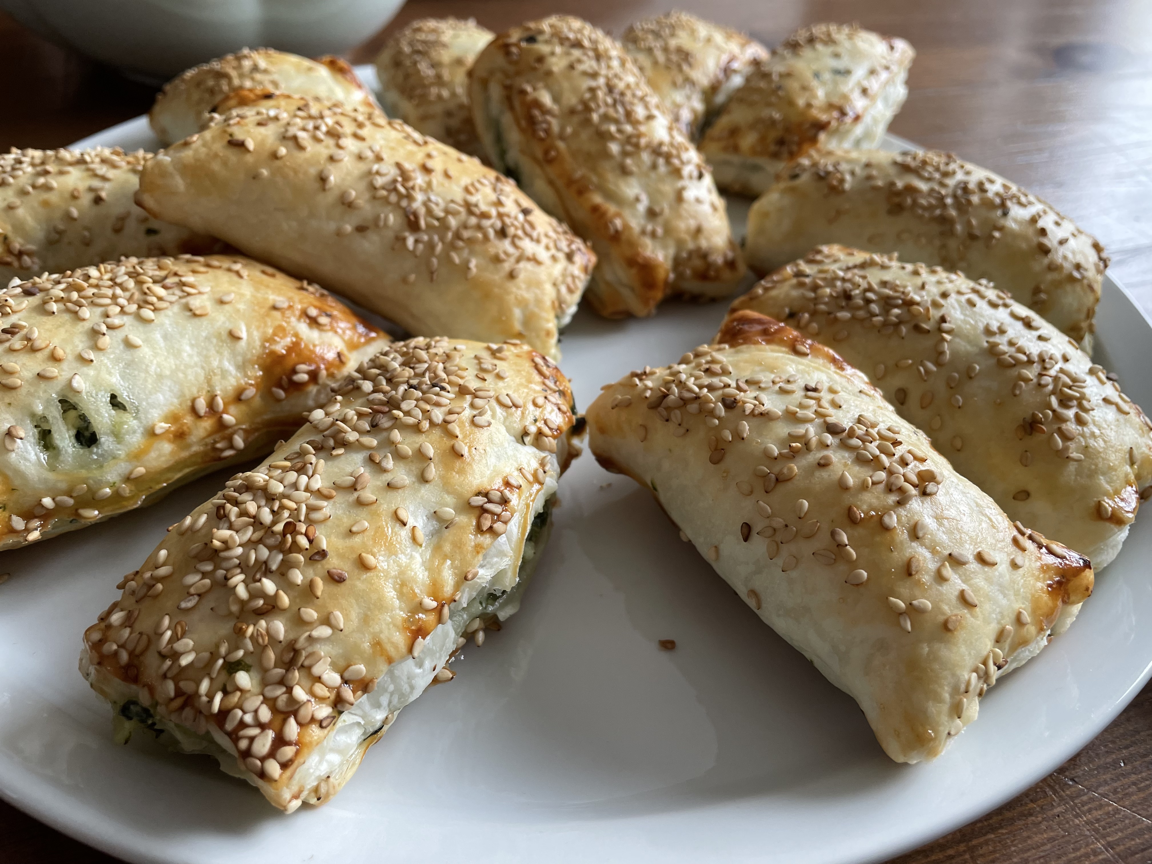 - Ei verquirlen und die Blätterteigtaschen damit bepinseln. Sesam drüber streuen und für ca 20 Minuten in den Ofen.
