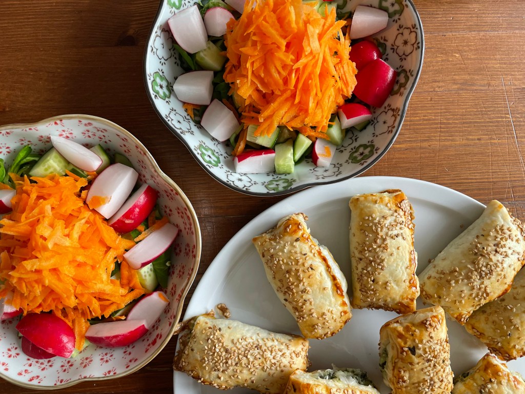 Tip: Die Füllung für den Blätterteig immer etwas früher zubereiten und im Kühlschrank aufbewahren. Wenn die Füllung zu warm ist, „schmilzt“ der Blätterteig und lässt sich kaum so verarbeiten, dass die Teigtaschen auslaufsicher sind.