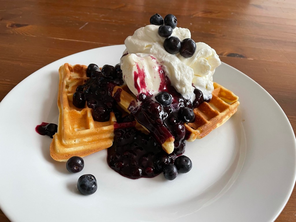 - Waffel auf einen Teller legen, die Blaubeeren darüber geben, eine Kugel Vanilleeis dazu und die Sahne.
