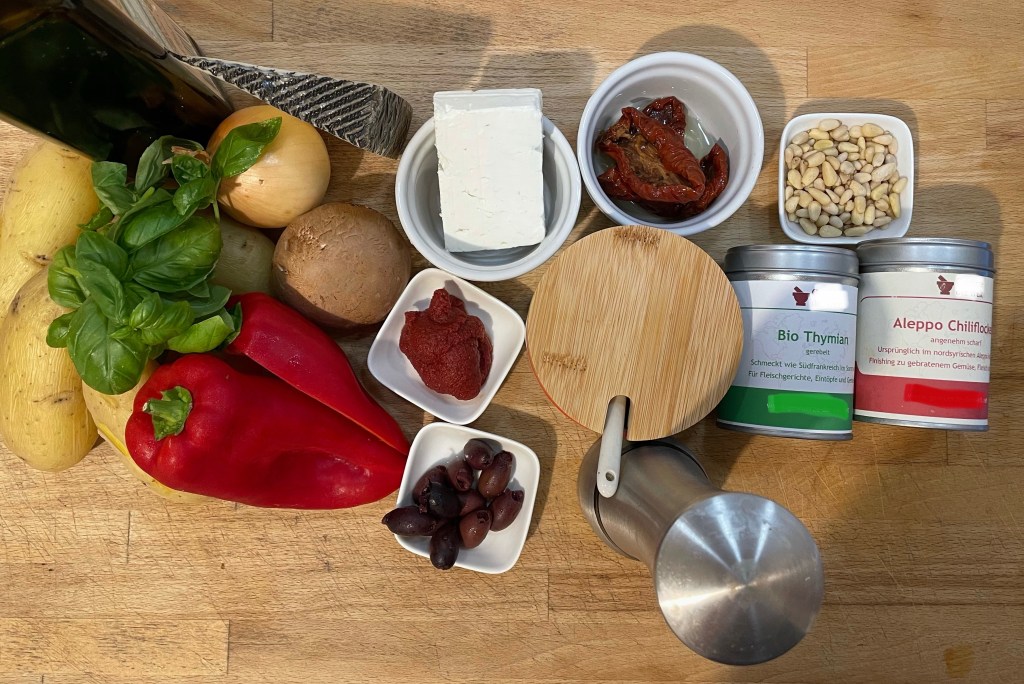° 100 g geriebener (veganer) Käse (ich hatte noch einen Bergkäse und etwas Manchego, nimm, was du magst und was da ist)