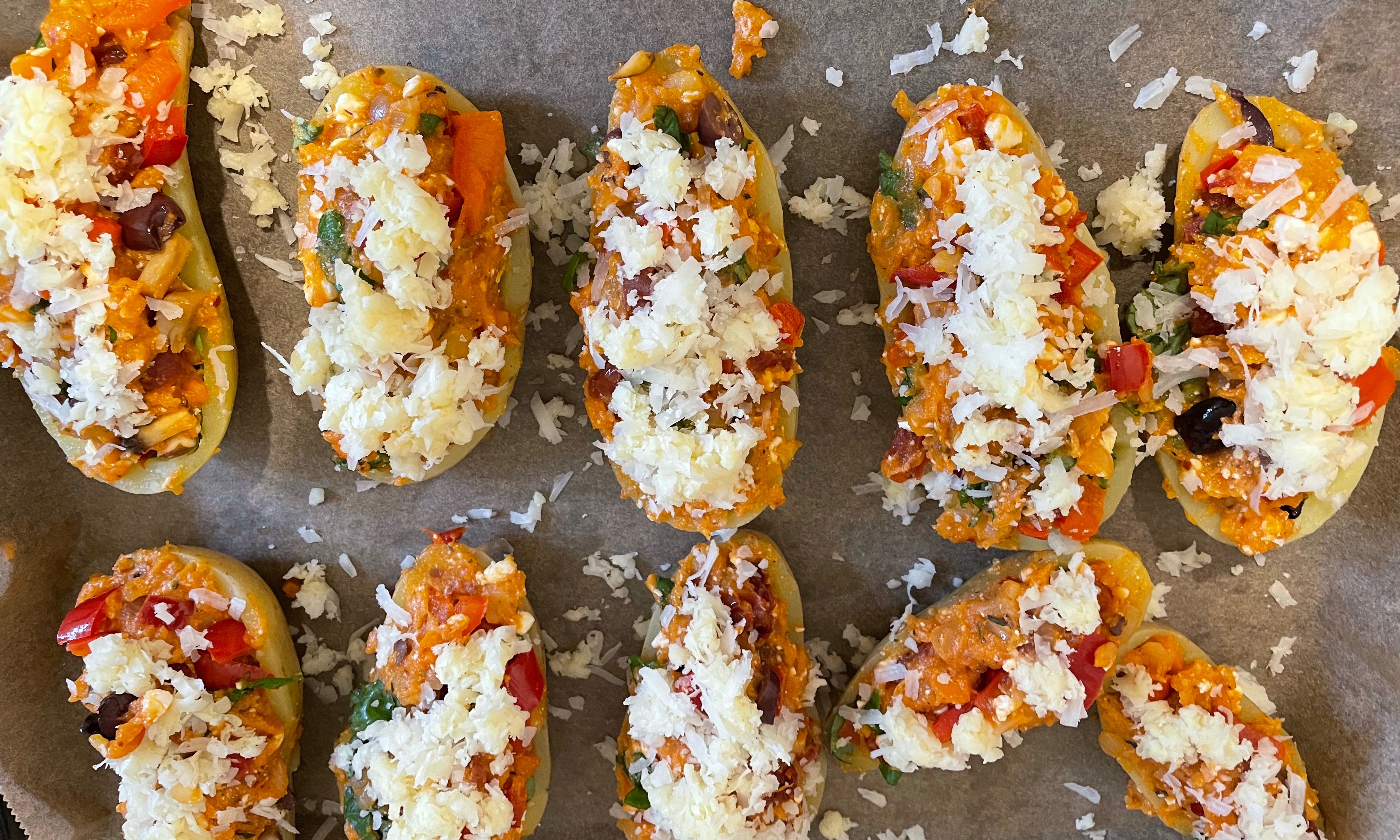 - Masse auf die Kartoffelhälften verteilen und mit Käse bestreuen. Für ca 10-15 Minuten backen, bis der Käse leicht gebräunt ist.