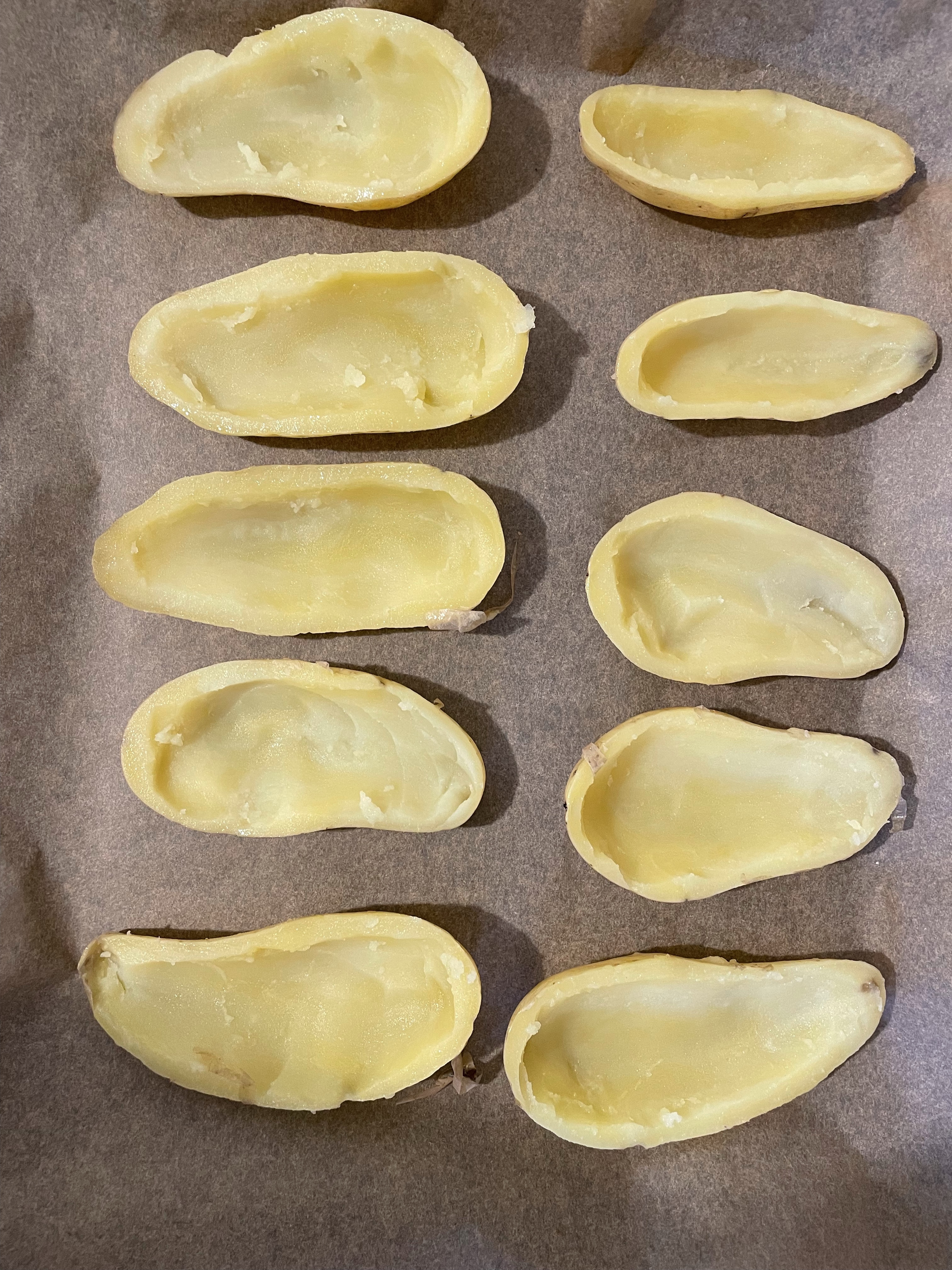 - Die Kartoffeln längs halbieren und mit einem Teelöffel das innere auslöffeln. Einen Rand von ca 0,5-1cm stehen lassen, so dass die Kartoffel nicht auseinander fällt.