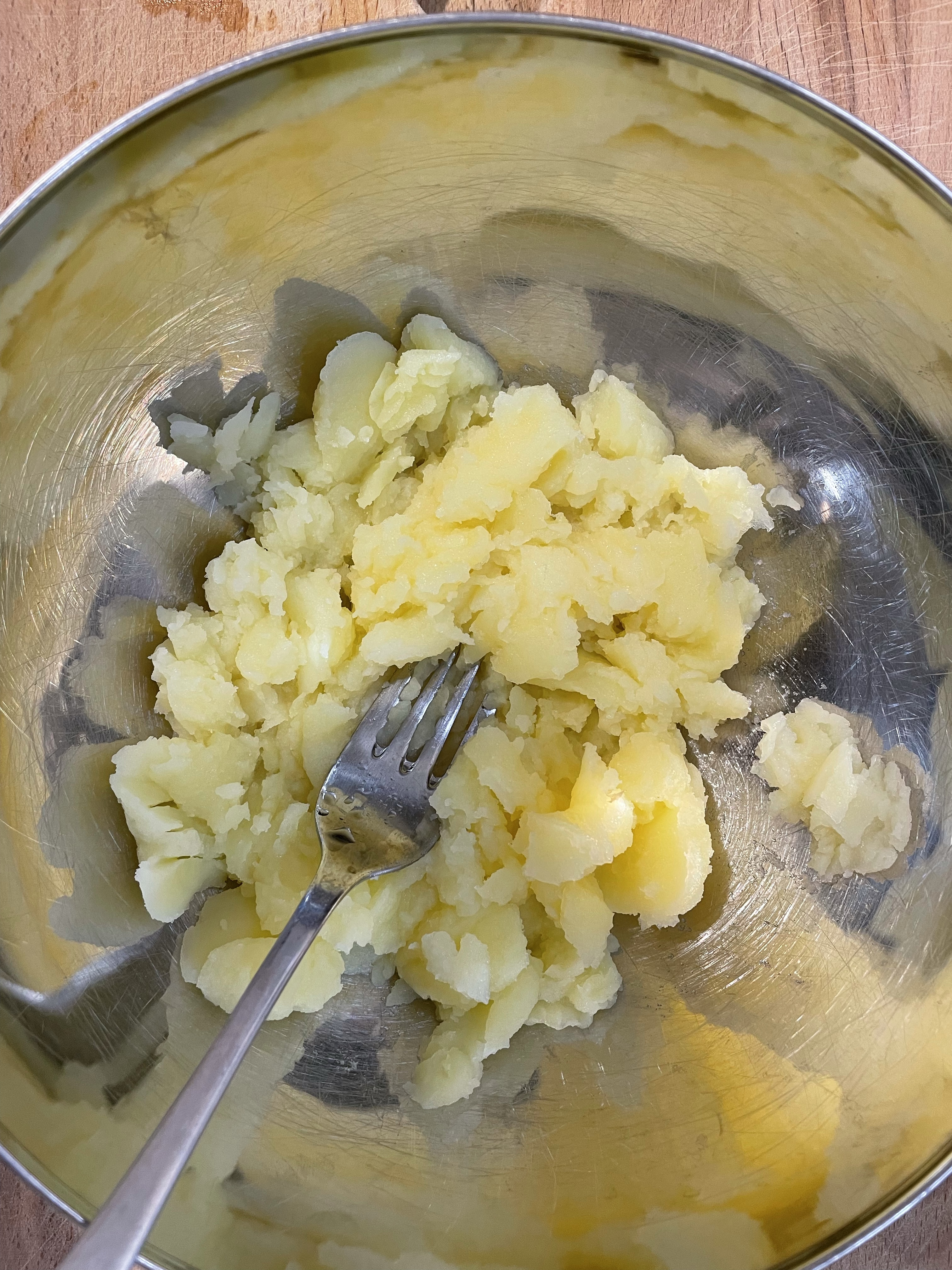 - Das Innere der Kartoffeln in eine Schüssel geben und mit einer Gabel durchkneten.