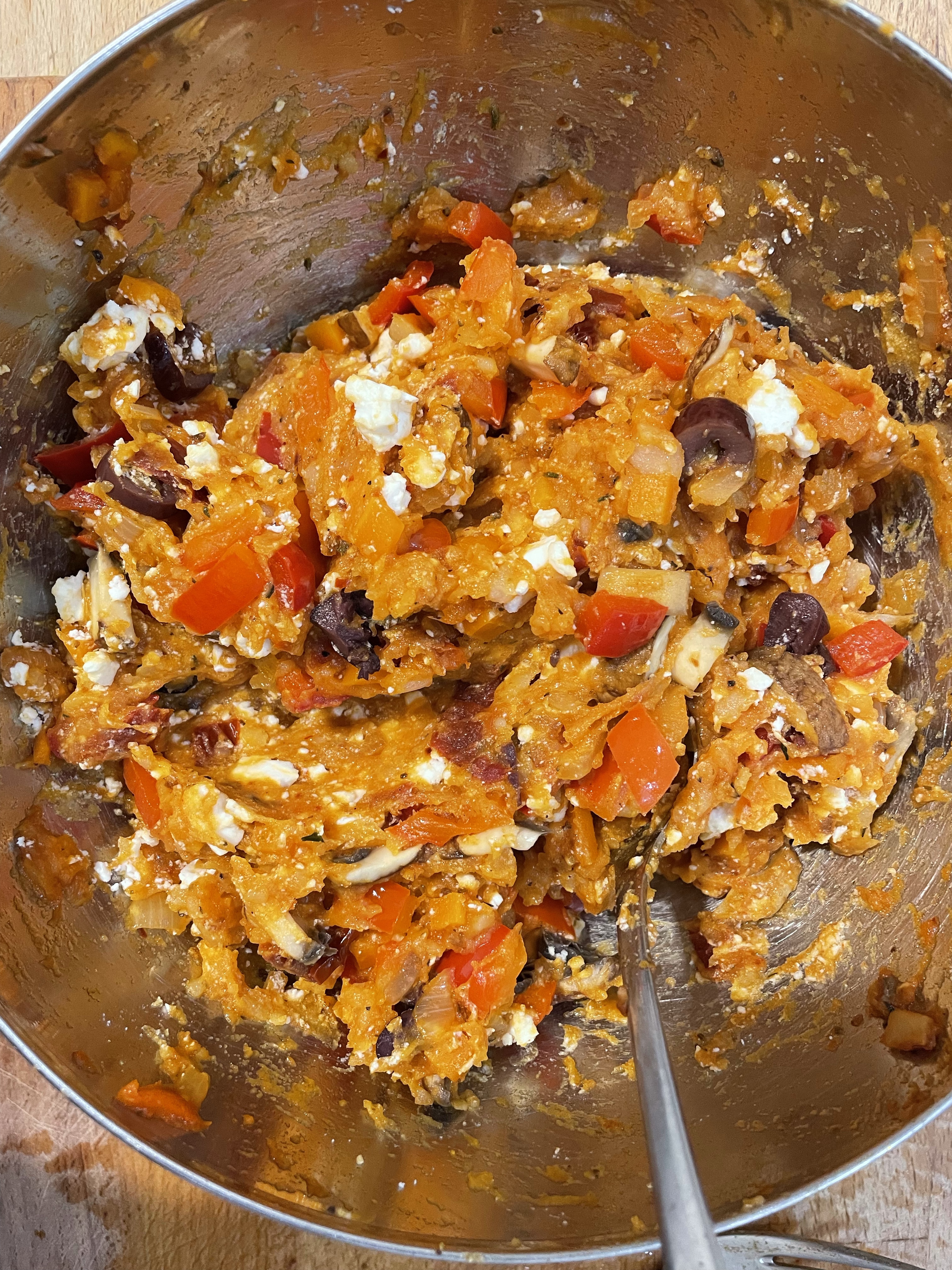 - Den Inhalt der Pfanne zu den zerdrückten Kartoffeln geben. Vermischen, Muskat dazu geben, und abschmecken, evt. Sriatcha dazu geben. Gehackten Basilikum und in Würfel geschnittenen Feta unterheben.