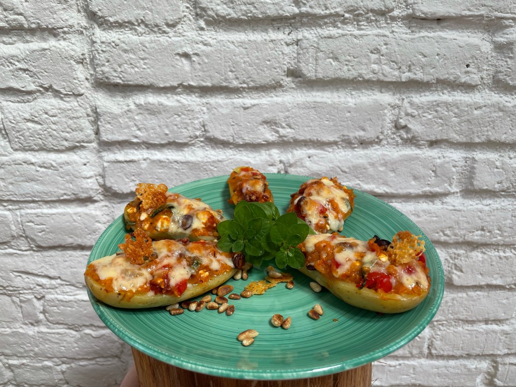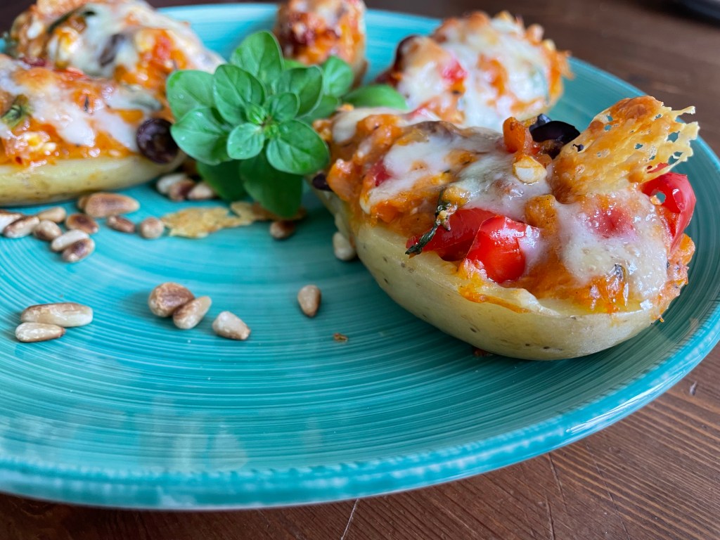 Es ist Bolognese vom Vortag übrig? Kein Problem, du mischst die Bolo mit dem, was du aus den Kartoffeln auslöffelst, hast vielleicht noch eine Paprika und Sprossen im Kühlschrank, die du klein schnippelst und untermischst, dann noch abschmeckst und ab in die Kartoffel, Käse drüber und backen.