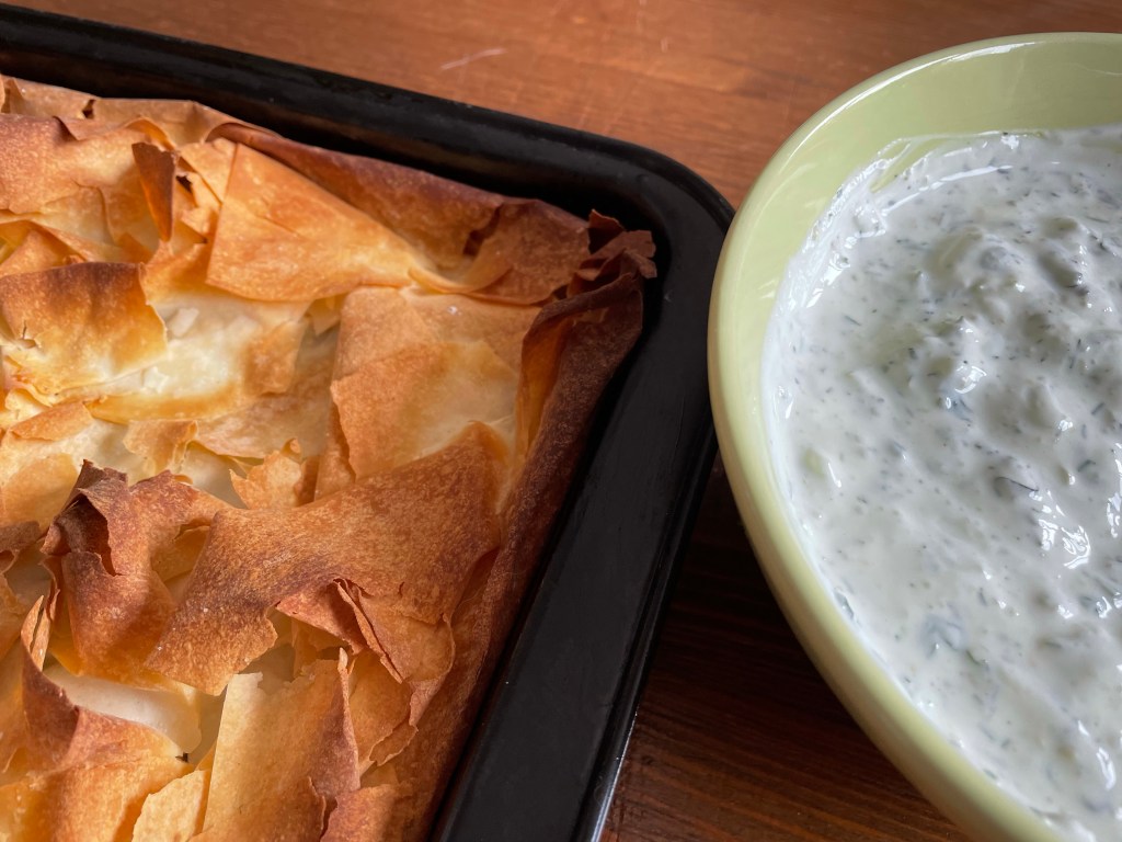 - In Stücke schneiden und mit dem Zaziki servieren.