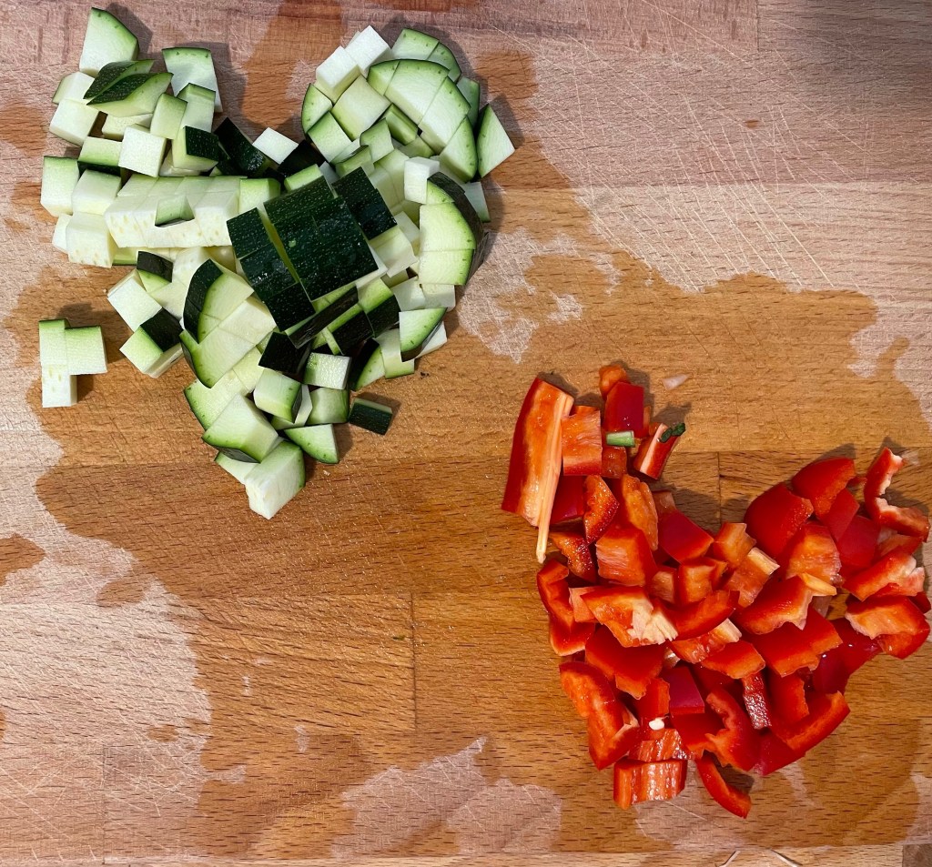 - Zucchini und Paprika in kleine Würfel schneiden.