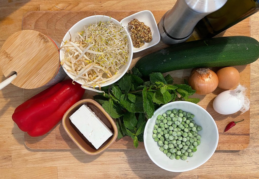 - Feta und Minze oben drauf verteilen und, ohne zu verrühren, das verquirlte Ei komplett darüber verteilen.