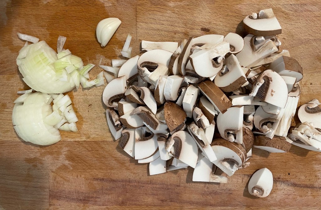 - Die Pilze putze und je nach Größe direkt in Scheiben schneiden oder vorher halbieren. Kleine Pilze einfach nur halbieren. Die Zwiebel in feine Würfel schneiden, den Knoblauch schälen, dieser wird später direkt in die Pfanne gepresst.