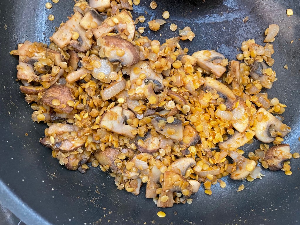 - Öl in einer Pfanne erhitzen Chiliflocken und die Zwiebeln anbraten, die Pilze dazu geben und mitbraten, den Knoblauch in die Pfanne pressen, gut vermischen.
