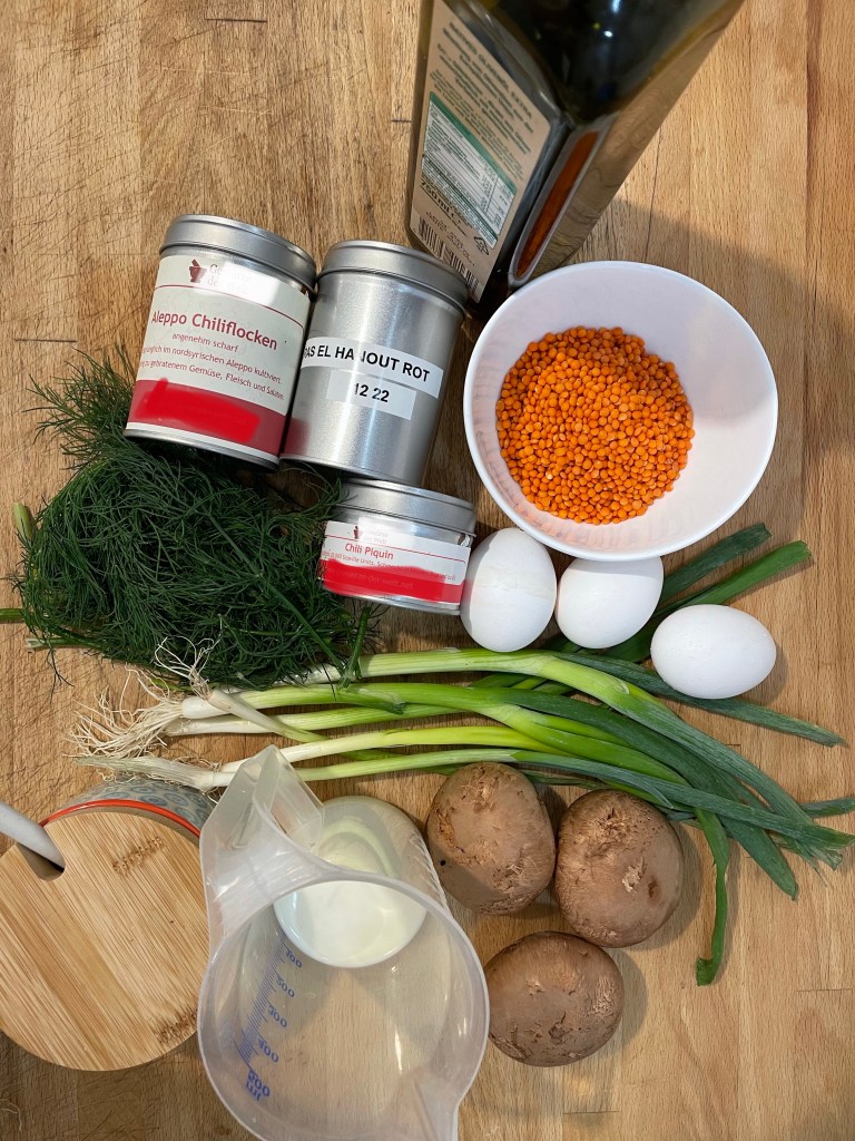 - Die Eier mit 2/3 des Dills, der Hälfte der Lauchzwiebeln, 1/2TL Ras-El-Hanout, der Milch und etwas Salz vermischen.