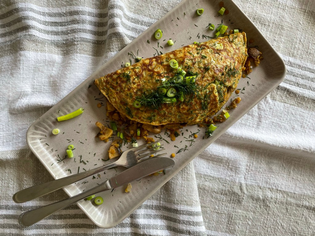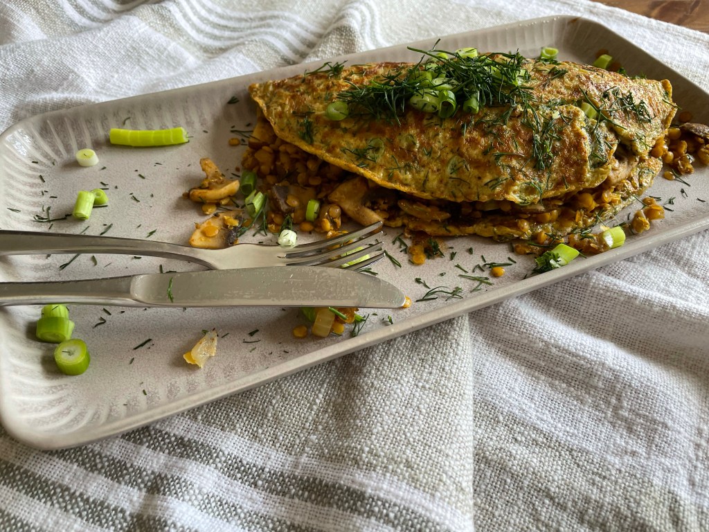 - Omelette auf einen Teller legen und mit der Linsen-Pilz-Masse füllen, dann zusammenklappen. Mit Dill und Lauchzwiebelringen garnieren und servieren.